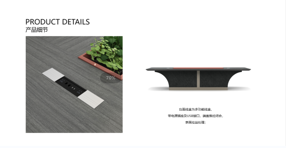 • 臺面采用50MM厚E1環保MFC板材60度斜邊工藝處理,全A標準PVC封邊,斜邊油漆工藝處理,支撐柜體采用16mm厚E1環保MFC板材,異形處理,香檳金拉絲紋理板材線條點綴;所有板材采用德國夏特飾面紙;配置金屬拉絲多功能線盒。